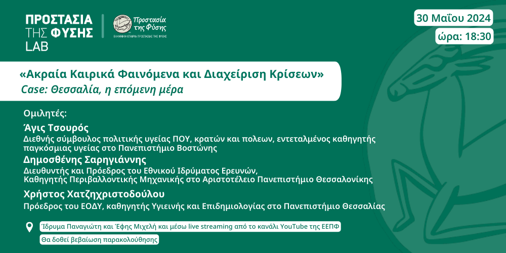 | Με το θέμα «Ακραία Καιρικά Φαινόμενα και Διαχείριση Κρίσεων» ολοκληρώνεται ο δεύτερος κύκλος «ΠΡΟΣΤΑΣΙΑ ΤΗΣ ΦΥΣΗΣ LAB» της Ελληνικής Εταιρίας Προστασίας της Φύσης, με ομιλητές τον κ. Άγι Τσουρό, Διεθνής σύμβουλος πολιτικής υγείας ΠΟΥ, κρατών και πολεων, εντεταλμένος καθηγητής παγκόσμιας υγείας στο Πανεπιστήμιο Βοστώνης, τον κ. Δημοσθένη Σαρηγιάννη, Διευθυντή και Πρόεδρο του Εθνικού Ιδρύματος Ερευνών και τον κ. Χρήστο Χατζηχριστοδούλου, Πρόεδρο του Εθνικού Οργανισμού Δημόσιας Υγείας (ΕΟΔΥ) και καθηγητή Υγιεινής και Επιδημιολογίας στο Πανεπιστήμιο Θεσσαλίας. Η ομιλία θα πραγματοποιηθεί την Πέμπτη 30 Μαΐου 2024 και ώρα 18:30, στην Αίθουσα Εκδηλώσεων του Ιδρύματος Παναγιώτη και Έφης Μιχελή. |