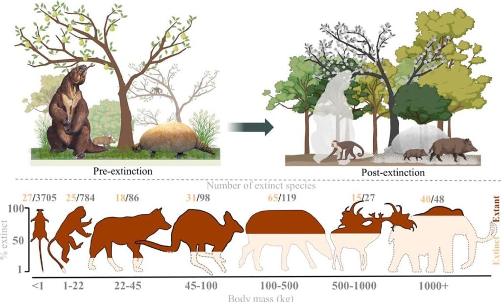Αν και η ευπάθεια μιας περιοχής στην κλιματική αλλαγή δεν έπαιξε κανένα ρόλο σε αυτές τις εξαφανίσεις, η εισερχόμενη μετανάστευση των ανθρώπων – κυνηγών είχε ρόλο, διαπίστωσε η ομάδα του Svenning. Το αρχείο απολιθωμάτων δείχνει ότι αυτά τα μεγάλα ζώα εξαφανίστηκαν σε πολύ διαφορετικούς χρόνους και με πολύ διαφορετικές ταχύτητες. Ορισμένα είδη μειώθηκαν σε αριθμό αρκετά γρήγορα και άλλα πιο σταδιακά, σε ορισμένες περιπτώσεις σε διάστημα 10.000 ετών ή και περισσότερο.
