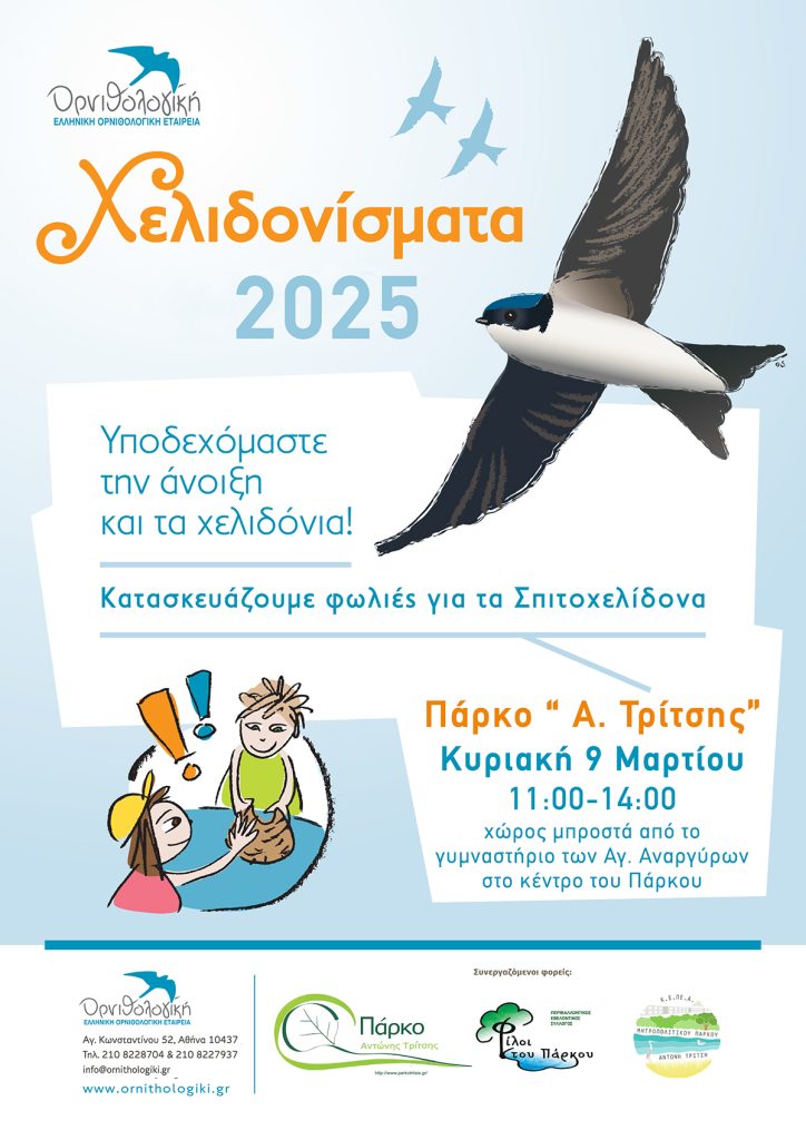 Σας προσκαλούμε στην κεντρική μας εκδήλωση την Κυριακή 9 Μαρτίου και ώρες 11:00 – 14:00στο Μητροπολιτικό Πάρκο «Α. Τρίτσης», για να καλωσορίσουμε την άνοιξη και να υποδεχτούμε τα χελιδόνια φτιάχνοντάς τους πήλινες φωλιές! Χώρος εκδήλωσης: Ανοιχτός χώρος δίπλα στο κανάλι και μπροστά στο Γυμναστήριο του Δήμου Αγίων Αναργύρων – Καματερού (η θέση της εκδήλωσης σε google maps ΕΔΩ).
