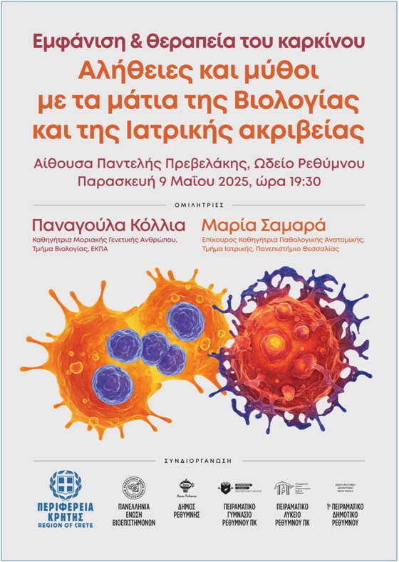 Μία ενδιαφέρουσα εκδήλωση θα πραγματοποιηθεί την Παρασκευή 9 Μαΐου στις 19.30 στην αίθουσα Παντελής Πρεβελάκης στο Ωδείο Ρεθύμνου με ομιλήτριες την καθηγήτρια Μοριακής Γενετικής Ανθρώπου του Τμήματος Βιολογίας του ΕΚΠΑ, Παναγούλα Κόλλια και την Επίκουρη Καθηγήτρια Παθολογικής Ανατομικής του Τμήματος Ιατρικής του Πανεπιστημίου Θεσσαλίας Μαρία Σαμαρά.