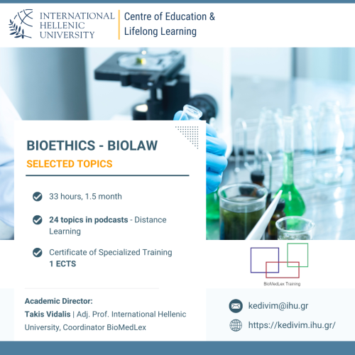 Το Διεθνές Πανεπιστήμιο της Ελλάδος (International Hellenic University) ανακοινώνει την έναρξη των εγγραφών στην 3η περίοδο του προγράμματος εξ αποστάσεως εκπαίδευσης στην αγγλική γλώσσα. Το πρόγραμμα αποτελείται από 24 μαθήματα σε μορφή podcasts, που καλύπτουν ένα ευρύτατο φάσμα θεμάτων δικαίου και ηθικής της σύγχρονης Ιατρικής και Βιοιατρικής, από τις σχέσεις ασθενούς/ιατρού, τις κλινικές δοκιμές και την υποβοηθούμενη αναπαραγωγή, ως τα ζητήματα τεχνητής νοημοσύνης στην Ιατρική και τις γενετικές επεμβάσεις στον ανθρώπινο οργανισμό. Παρέχεται πρόσθετο εκπαιδευτικό υλικό για κάθε μάθημα και με την ολοκλήρωση του προγράμματος η δυνατότητα τεστ πολλαπλών επιλογών (multiple choice) για την απόκτηση σχετικού πιστοποιητικού από το Πανεπιστήμιο.